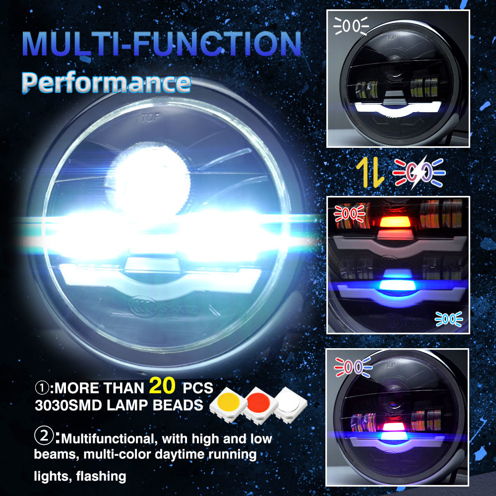 High-performance 5.75-inch motorcycle headlight assembly featuring bright LED projection with red, blue, and white options. Rated at 45W with 4800LM output for superior visibility.