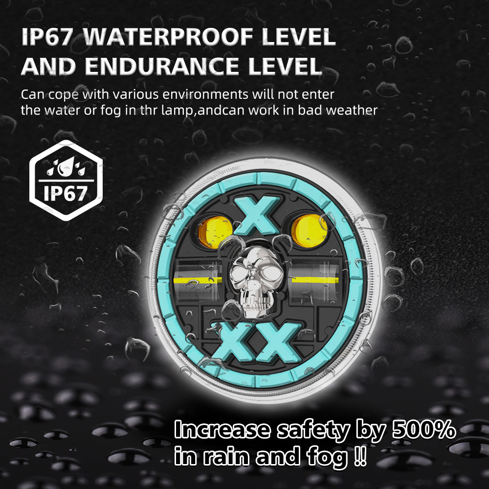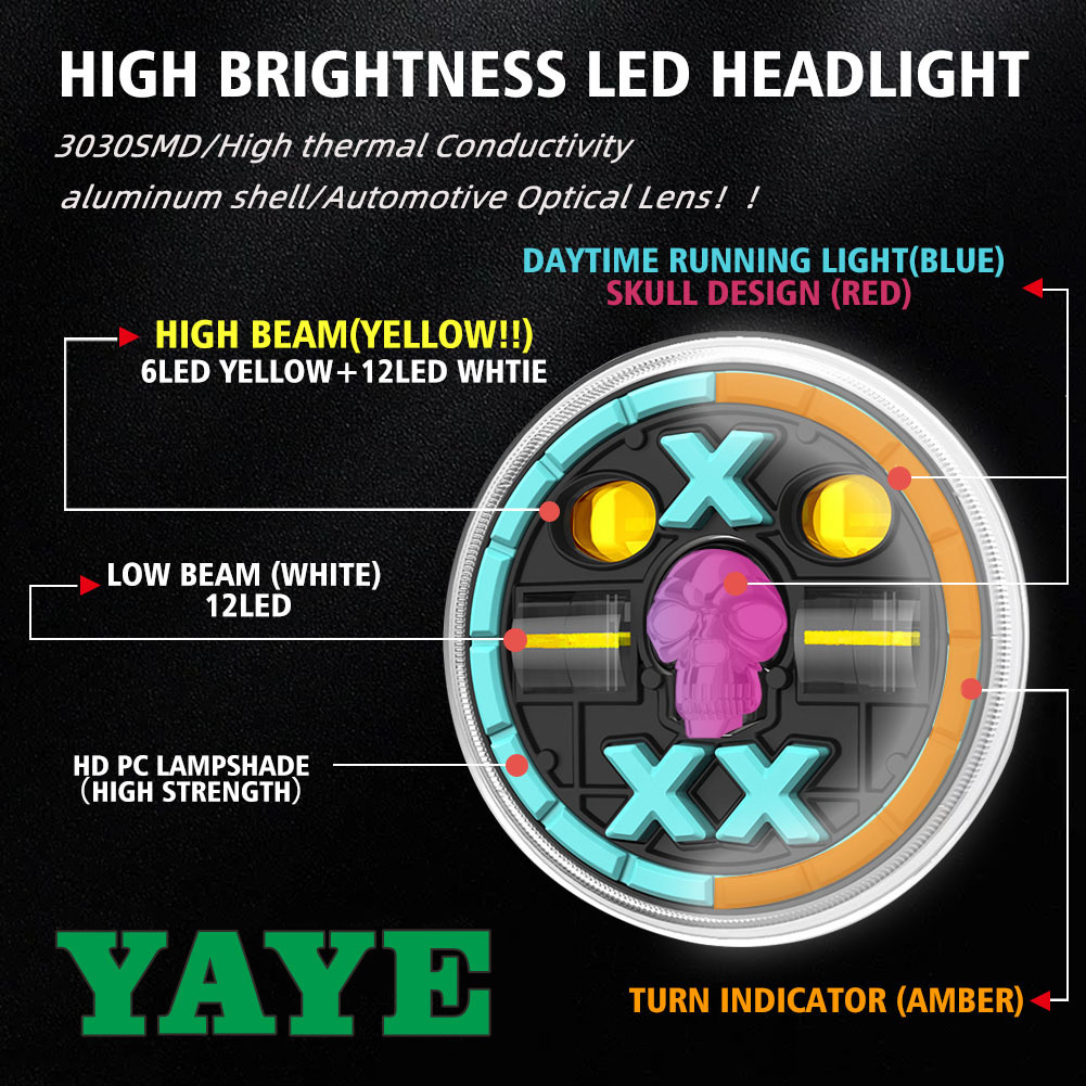 YAYE 5.75 اینچ GN125 زرد سفید ال ای دی لوازم جانبی سرخ جمجمه موتورسیکلت چراغ جلو DRL با لنز نوری 0